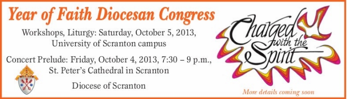 "Charged With The Spirit," a Year of Faith Diocesan Congress on October 5, 2013 on the University of Scranton campus: a day of prayer, liturgy and 40 workshops centered around topics essential to vibrant parish life to help us deepen our relationship with Jesus and share our faith. Concluding Mass celebrated by the Most Reverend Joseph C. Bambera, D.D., J.C.L., Bishop of Scranton. Concert prelude featuring liturgical music the evening before, October 4, 2013 in the Cathedral of Saint Peter,...