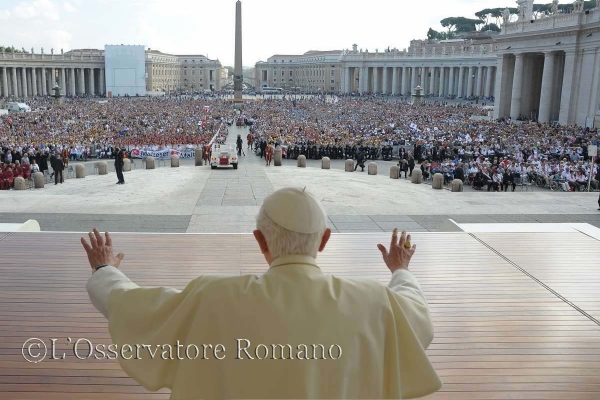 Qui permettetemi di tornare ancora una volta al 19 aprile 2005. La gravità della decisione è stata proprio anche nel fatto che da quel momento in poi ero impegnato sempre e per sempre dal Signore. Sempre – chi assume il ministero petrino non ha più alcuna privacy. Appartiene sempre e totalmente a tutti, a tutta la Chiesa. Alla sua vita viene, per così dire, totalmente tolta la dimensione privata. Ho potuto sperimentare, e lo sperimento precisamente ora, che uno riceve la vita proprio quando la dona. Prima ho detto che molte persone che amano il Signore amano anche il Successore di san Pietro e sono affezionate a lui; che il Papa ha veramente fratelli e sorelle, figli e figlie in tutto il mondo, e che si sente al sicuro nell’abbraccio della vostra comunione; perché non appartiene più a se stesso, appartiene a tutti e tutti appartengono a lui.
